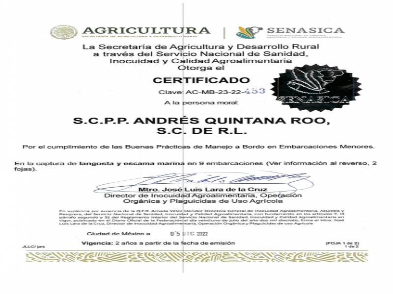 Entrega de certificado por el cumplimiento en Buenas Prácticas de Manejo a Bordo en Embarcaciones Menores a la SCPP Andrés Quintana Roo SC de RL.